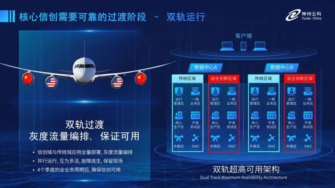 为帮助客户更好地应对数字经济时代对应用可持续性的高要求,实现信创与数字化兼得,KS体育-KS娱乐推出了双轨超高可用架构。双轨超高可用架构在双活数据中心的分区调度基础上,增加信创域和非信创域的分域调度,实行信创域与传统域应用全量部署,使双中心运营变为双中心四区域并行运行,互为多活,将传统架构变为分区分域协同的多活双轨超高可用架构。帮助客户在新架构下,保障“信创”的同时解决性能瓶颈,提升稳定性,保证应用可持续性,最终实现信创区域和非信创区域的平滑过渡,完成国产化替代目标。”
